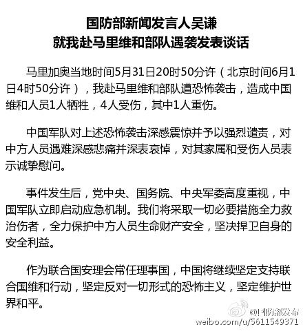 国防部新闻发言人吴谦就我赴马里维和部队遇袭发表谈话