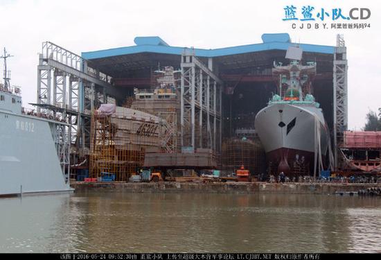 尚未下水的46301号海警船与同期建造的一艘054A型护卫舰,可以看到二者外观颇为类似