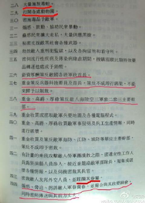 该书作者名为有廷麟,是台军特战军官,蒋介石“次子”蒋纬国还为此书作序,今天这本书在台湾地区的一些高校内还有出借。书中有廷麟公开宣称,台军应使用包括强奸、屠杀、大范围投毒、破坏民生设施等卑鄙手段对祖国大陆进行破坏,其手段之下作、无耻比起二战时的日军都有过之而无不及,令人发指。