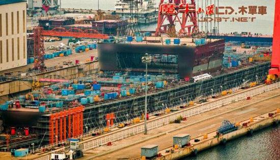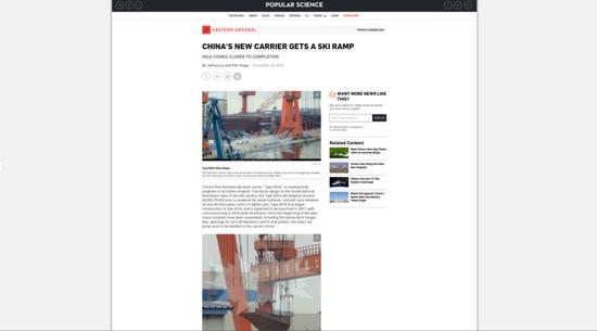近日,美国《大众科学》杂志官方网站以《中国新航母安装滑跃起飞段》为题报道了中国第一艘国产航母的最新动态。文章还配发了一张照片称,新航母的滑跃起飞段将很快会焊接到主甲板上。对此有媒体报道称,中国第二艘国产航母存在使用电磁弹射技术的可能性,但最终是否使用这项技术,要看最后的决策。