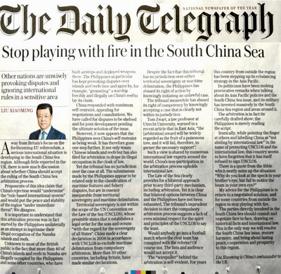 6月10日,驻英大使刘晓明也在英国《每日电讯报》发表署名文章:《不要在南海玩火》。文章指出,“一些人称,如果中国不接受仲裁结果,就是破坏了‘基于规则的国际秩序’,南海和平稳定就岌岌可危。我们绝不同意这种观点。”