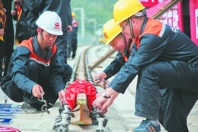 16日,工人对沪昆高铁全线最后一段轨道进行施工。