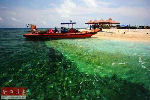 一艘小船停靠在中国南海西沙群岛水域。新华社发