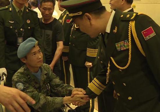 受伤的4名维和英雄一进候机大厅,就受到了在场的军地各界的热烈欢迎,中央军委和陆军专门为远道归来的维和英雄举行了庄严简朴的迎接仪式,并向4名遇袭受伤官兵表示亲切慰问,称赞他们在危急时刻恪尽职守,妥善处置,勇往直前,不畏牺牲,充分展现了我军和平之师、威武之师、胜利之师的良好形象,充分展现了中国人民热爱和平、维护和平的坚定决心。