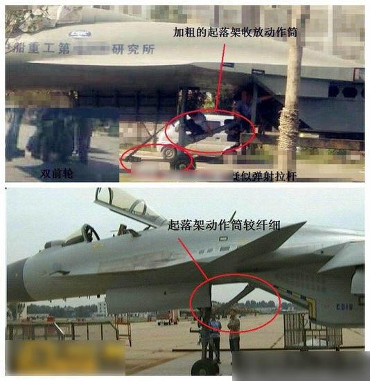 此前,网络上曾出现的一张图片显示,国内某船舶类研究所的名称出现在一架歼-15舰载战斗机模型上,并且图片还显示这架歼-15舰载战斗机模型的起落架已经进行了改装:起落架收放动作筒明显加粗、双前轮前部安装了疑似弹射拉杆。从图片所示的研究所官方网站得知,该所是国内规模最大和最有影响的船舶特辅机电设备研究所,据此多位军事观察员曾分析认为,这表明国产舰载战斗机在进行弹射起飞的相关研究。