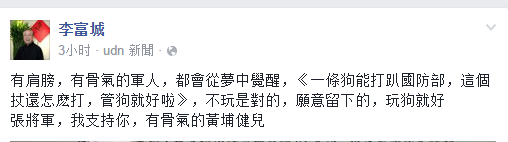 李富城称,一条狗能打趴“国防部”,“这个仗还怎么打,管狗就好啦”,他认为张俊达“不玩(退伍)是对的”,“愿意留下的,玩狗就好”。