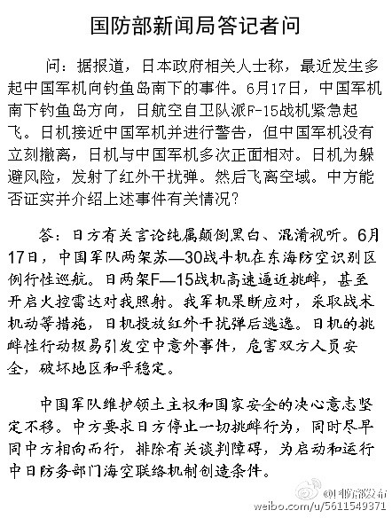 日方称中国军机向钓鱼岛南下 国防部回应:颠倒黑白混淆视听