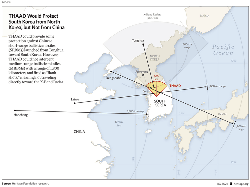 美国解释THAAD导弹不会影响中国的理由:THAAD无法拦截侧面飞来的中程导弹,所以顶多能为日本提供提前预警,然而由于探测范围狭窄,也不能起太大作用——当然,这里没有提THAAD的雷达只要稍加修改探测范围可以大幅提高,只是会失去火控能力而已