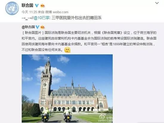今天早晨10:45,联合国在官微发文称,国际法院是联合国主要司法机关,常设仲裁法院和联合国没有任何关系。随后,一位网友针对联合国的澄清写道:“三甲医院里外包出去的莆田系”。联合国官微也进行了转载。
