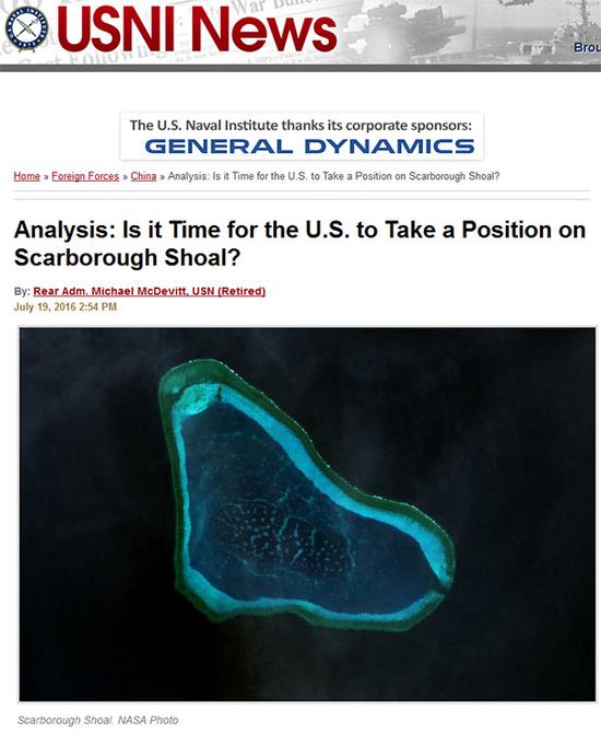 当地时间7月19日,美国海军新闻网站刊出退役海军少将迈克尔?麦克德维特(Michael McDevitt)的文章,文中罔顾黄岩岛是中国固有领土的事实,以及各国对他国间领土争议一般不持立场的国际惯例,竟称黄岩岛和南海其他岛屿不同,是美国继承自西班牙、后转交菲律宾的“无争议领土”,并处于美军武力保卫下。文章还提到,美国认为中国有在黄岩岛“种岛”的可能,对菲律宾和驻菲美军基地威胁极大。
