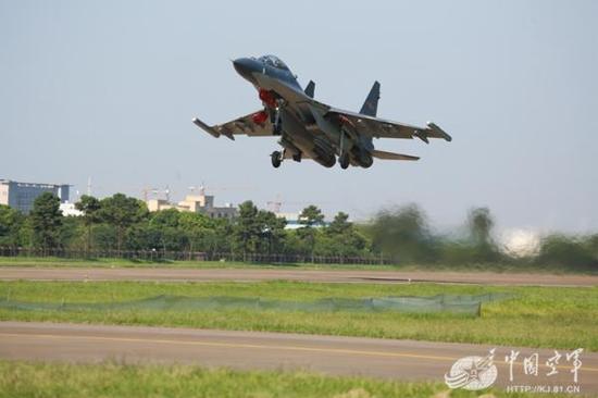 携带导弹起飞,注意其机翼中间挂架装有复合挂架,可能在比赛中还有携带炸弹或者多枚空空导弹实施的项目