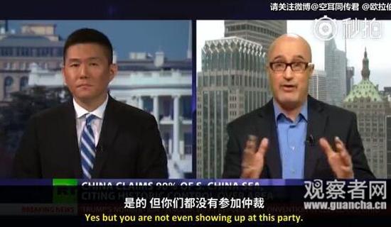 本周在美颇具影响力的电视台RT America 再邀央视北美首席政治记者王冠同美国政治专家就南海仲裁结果展开激烈辩论。美国专家向王冠抛出了“南沙黄岩岛分明离菲律宾更近”“全世界谁还相信中国的宣传?”等质问,态度强硬,节节逼近。央视记者王冠,列举出了《国际海洋法公约》条文,以事实和法理依据,从国际政治、国际法、历史等角度从容应对,指出了对方的知识缺陷和错误逻辑。最后主持人以“王冠,你提出了些我们无法立即回答的重要问题”,结束了这期节目。让我们一起来看一下这期节目,感受一下现场中美代表交叉辩论的激烈交锋。