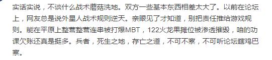 比如说最近有这么一条微博,张嘴就是“双方一些基本的东西相差太大了”“别把责任推给游戏规则”“整营整连串被打爆MBT,122火龙果摊位被渗透摧毁”……