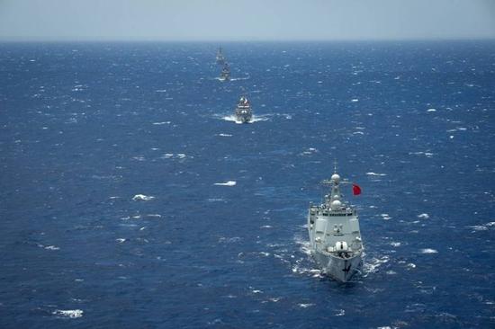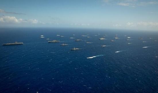 夏威夷当地时间早间6点,参加环太军演大编队航拍的各舰船抵达考爱岛以西的待机区,舰船间的初始横距、纵距为5海里,也就是约9公里。