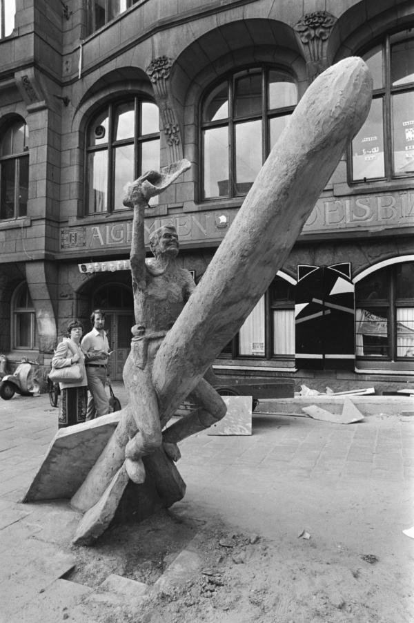 英国民众竖起的里根雕塑,雕塑造型模仿《奇爱博士》里骑在核弹上被扔向苏联的美国军官