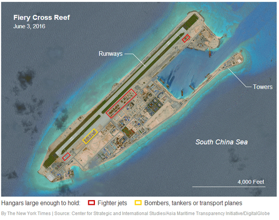 美国《纽约时报》当地时间8月8日报道,美国智库“战略与国际研究中心(CSIS)”称,7月最新卫星图片显示,中国已在南海三座岛礁建成飞机库。该智库还据此臆测,中国或将在南海推进“军事化”,因为这些飞机库都达到了军用规格,可以停放任何型号的军机。