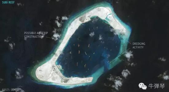 这是2015年9月3日图片,即去年九三大阅兵当日拍的照片,全国放假一天,但填海种岛正在进行中,CSIS特意注明,左侧出现了可能的机场跑道。