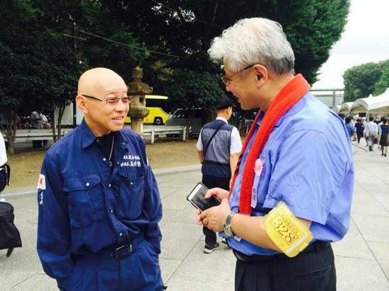 日本新华侨报总编辑蒋丰说:在靖国神社,直击日本右翼民族派团体——新日本义央塾。这位小头目跟我说,‘战后71周年了,我是来这里参拜英灵的。我们就是不能忘记了他们。’提到紧张的中日关系时,他说:‘不能打战啊,中国太大我们太小,我相信日中两国的领导人都是有智慧的。’”