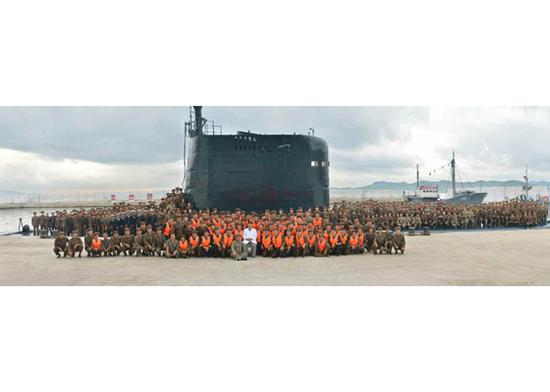 全体参试人员与金正恩在“新浦”级潜艇前合影,可以看到潜艇指挥台围壳的部分细节,例如排水孔,表明该艇只有一个导弹发射管。