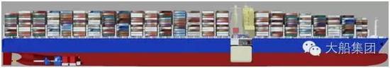 大船重工集团微信公众号公布的2万箱COGES集装箱船示意图。其全长399.8米,型宽58.6米,航速22节,实际最多可搭载20,288个标准集装箱。其燃料以液化天然气(LNG)形式储存在B型舱中。(B型舱是一种以含镍9%的特种钢构成制荡结构和舱壁结构的低温液化气舱室,成本比现在广泛应用的殷瓦钢薄膜型舱低。)