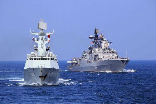 16日,中国海军黄山舰(左)和俄罗斯军舰“特里布茨海军上将”号反潜舰组成编队驶向演习海区