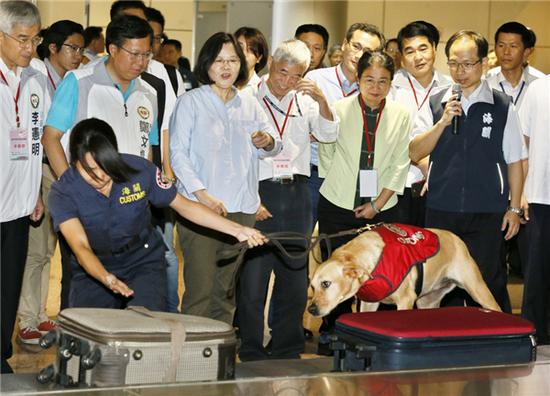 蔡英文先前往第二航厦管制区一楼行李转盘看缉毒犬,随后在地下二楼桃捷A13站前听