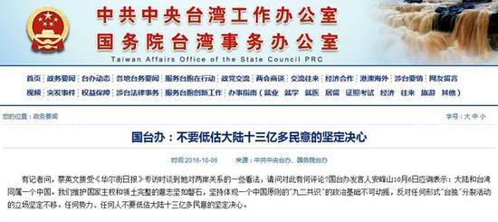 国台办发言人安峰山10月6日应询表示:大陆和台湾同属一个中国。我们维护国家主权和领土完整的意志坚如磐石,坚持体现一个中国原则的“九二共识”的政治基础不可动摇,反对任何形式“台独”分裂活动的立场坚定不移。任何势力、任何人不要低估大陆十三亿多民意的坚定决心。