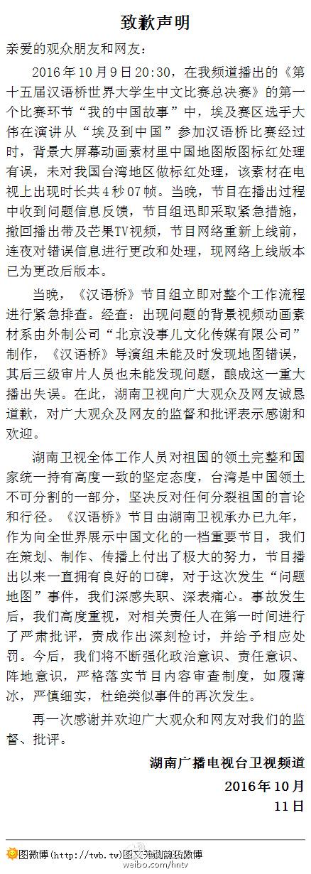 10 月11日晚,湖南卫视官方微博发布致歉声明,称《汉语桥》节目组对整个工作流程进行紧急排查,经查:出现问题的背景视频动画素材系由外制公司“北京没事儿 文化传媒有限公司”制作,《汉语桥》导演组未能及时发现地图错误,其后三级审片人员也未能发现问题,酿成这一重大播出失误。在此,湖南卫视向广大观众及网 友诚恳道歉,对广大观众及网友的监督和批评表示感谢和欢迎。以下为致歉声明全文:
