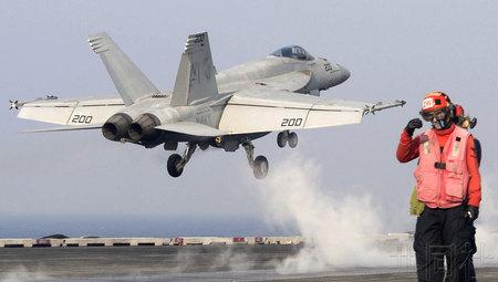 10月14日,美“里根”号核航母在黄海海域向媒体展示舰载机起降训练。