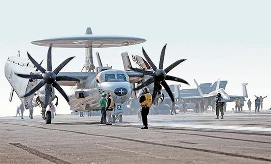 图为10月14日,“鹰眼”空中预警机在参加韩美联合军演的美核动力航母“里根号”甲板上准备起飞。(图片来源:韩国《中央日报》)