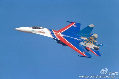“俄罗斯勇士”成立于1991年,与独立后的俄罗斯联邦同龄,是世界上惟一一支使用重型战斗机进行表演的飞行队,采用的是SU-27单座及SU-27UB双座型战斗机,6架空中表演飞机已重达150吨。表演飞机都涂成了俄罗斯国旗的颜色,飞行队有自己的标志——天蓝色背景中的菱形盾牌。飞机的机器和尾翼前缘为红色箭形装饰,主机极具动感。垂尾上红星和金黄色旭日光辉,是俄罗斯空军的图案。在作战飞机上一般不在尾上喷涂,只在表演飞机上装饰。