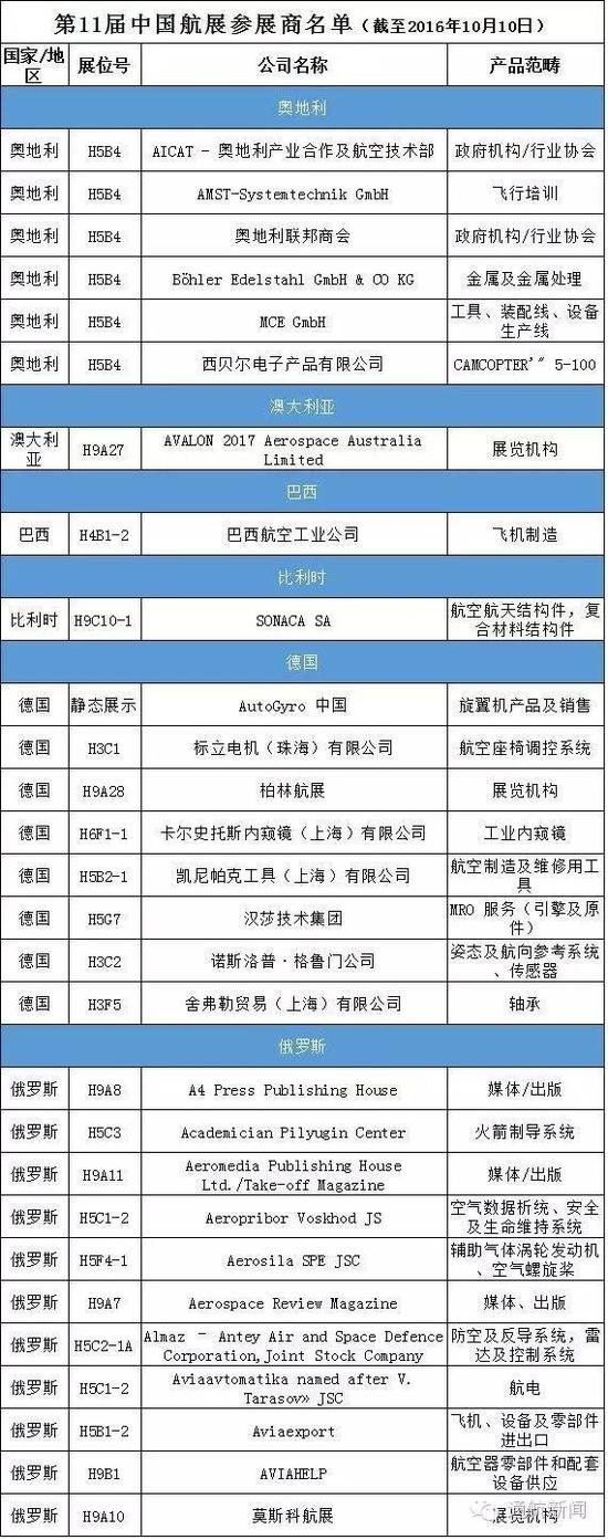 2016年,11月1日-6日,第十一届中国国际航空展将在珠海盛大举办。日前组委会发布了本届航展的参展商名单和展位号。包括国内外知名的波音、空客、苏霍伊、罗尔斯-罗伊斯,以及中航的沈飞、成飞、西飞等公司都将参展。参展商名单如下: