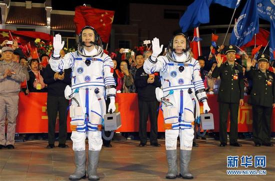 10月17日,神舟十一号航天员出征仪式在酒泉卫星发射中心举行。这是航天员景海鹏(右)、陈冬在出征仪式上挥手。 新华社发
