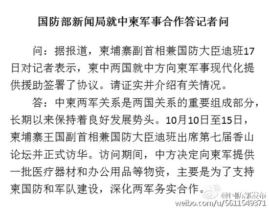 军事:国防部回应军事援助柬埔寨 确认将向柬军提供物资