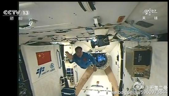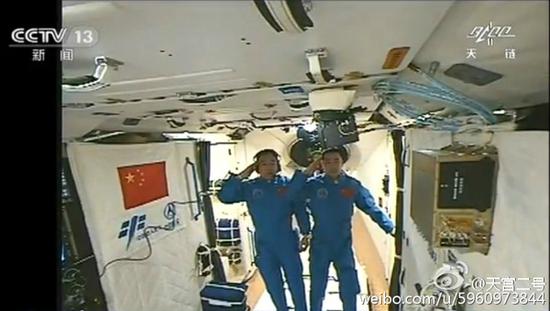 6时30分左右,景海鹏率先进入天宫二号。大约半小时后,陈冬也“飘”进来啦。两人一起敬礼,向全国人民问好。