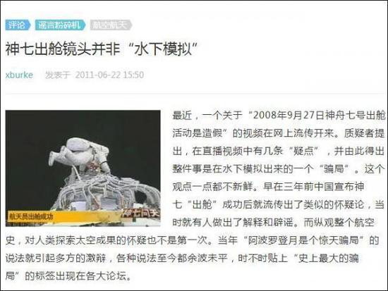 2011年,关于“2008年9月27日神舟七号出舱活动是造假”的视频再度在网上流传开来。质疑者提出,在直播视频中有几条“疑点”,并由此得出整件事是在水下模拟出来的一个“骗局”。