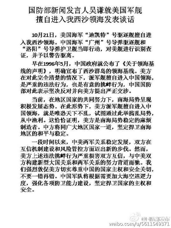 早在1996年5月,中国政府就公布了《关于领海基线的声明》,明确宣布了西沙群岛的领海基线。美方在对此完全清楚的情况下,派军舰擅自进入中国领海,是严重的违法行为,也是有意的挑衅行为,中国国防部对此表示坚决反对并向美方提出严正交涉。
