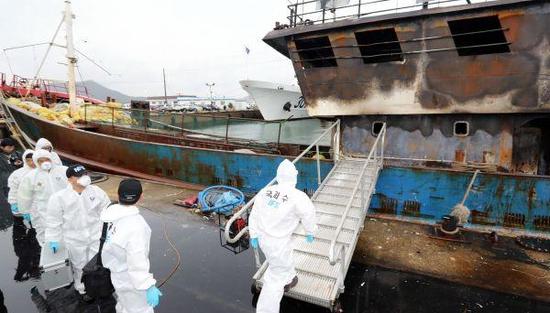 9月30日,在韩国木浦海警码头,工作人员准备登上事发中国渔船进行调查。新华社发