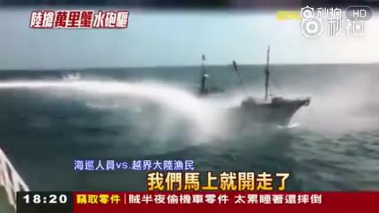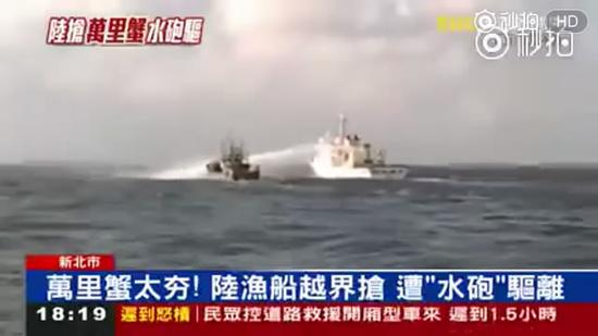 据台湾东森新闻网25日报道,事发渔场位于台湾北部富贵角西北海域,“海巡署”新北舰巡航时发现一艘大陆籍渔船正准备捕捞万里蟹,当场打开强力水柱驱逐该渔船。