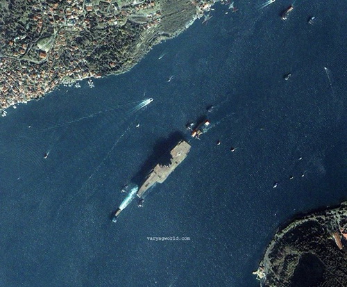 2001年11月1日,瓦良格号在拖船拖曳下通过土耳其博斯普鲁斯海峡。