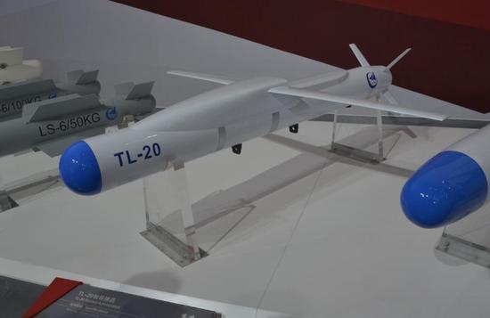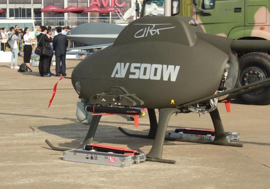 中航工业展示的AV500W无人机,该机似乎携带了一种尺寸很小的滑翔制导炸弹,没有标牌展示其名称,公众日上该弹药没有展示