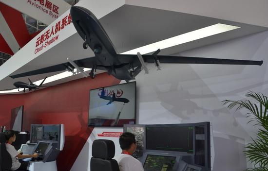 中航展台上的“云影”无人机携带两枚YJ-9E导弹和两枚50公斤炸弹