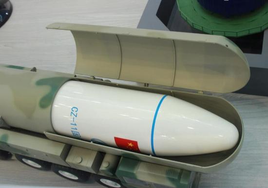 航天科技集团“长征11”号火箭发射车,该火箭在洲际导弹基础上加长第三级,因此采用了10轴发射车