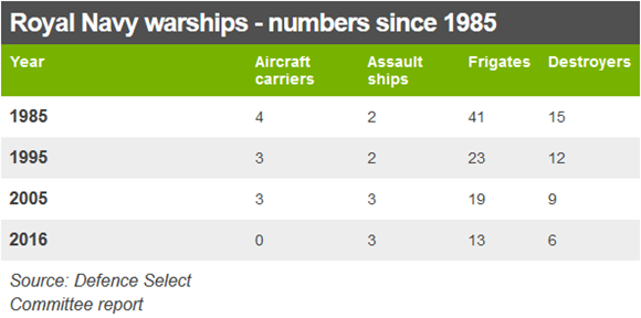 从这份委员会报告中,我们可以清楚地看到自1985年以来,英国海军军力的变化:航母从4艘到0艘(伊丽莎白女王级航空母舰尚未服役),护卫舰从41艘到13艘,驱逐舰从15艘到6 艘。