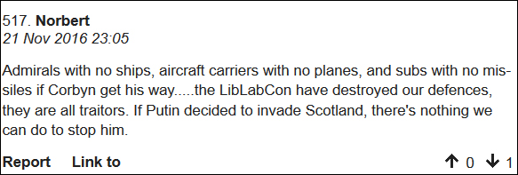 “如果让工党的科尔宾(Corbyn)上台,那么我们的海军将彻底没有船,航母没有飞机,潜艇没有鱼雷……台上的保守党也毁了我们的国防,这些人都是叛国者,如果普京决定入侵苏格兰,我们将毫无抵抗能力”