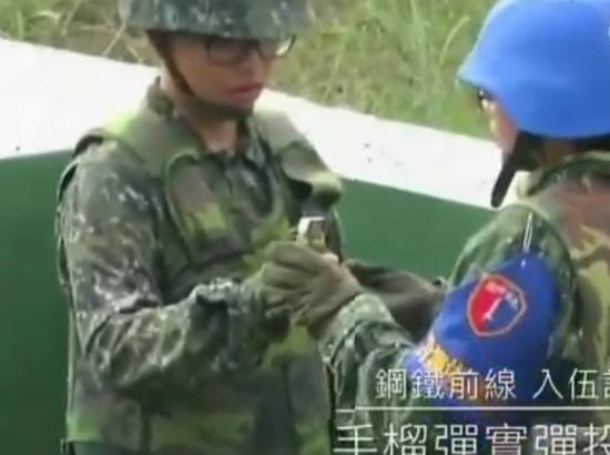 视频中,台军新兵听从训场指挥官与阵地投掷指导官口令,拨开安全闸,拉出保险销,手指目标物,投掷预备,投弹,与指导官协力将手榴弹往目标区投掷。