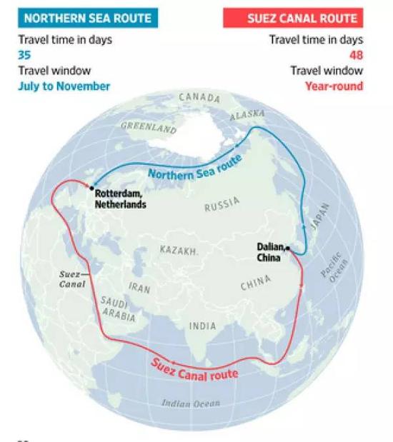 从地球仪上,我们可以清晰看到,连接大西洋和太平洋的最近距离正是取路北冰洋的北极航道,而非传统上经过苏伊士运河和巴拿马运河线路。