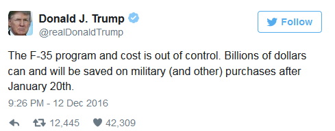 昨晚(美东时间12日6点26分),特朗普在推特上发言:“F-35项目的成本已经失控,在1月20日之后国防和其他采购可以,也将会,省下几十亿美元。”