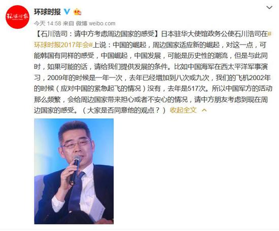 环球时报官方微博12月17日消息:[石川浩司:请中方考虑周边国家的感受]日本驻华大使馆政务公使石川浩司表示:中国的崛起,周边国家适应新的崛起,对这一点,可能韩国有同样的感受,中国崛起,中国发展,可能是历史性的潮流,但是与此同时,如果可能的话,请给我们提供发展的条件。比如中国海军在西太平洋军事演习,2009年的时候是一年一次,去年已经增加到八次或九次,我们的飞机2002年的时候(应对中国的紧急起飞的情况)没有,去年是517次。所以中国军方的活动那么频繁,会给周边国家带来担心或者不安心的情况,请中方朋友考虑到现在周边国家的感受。