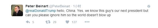 网友Peter Beinart:你好,中国。是的,我们都知道这货将是我们的下一位总统。您们能不能无视他,这样世界就不会炸锅了。